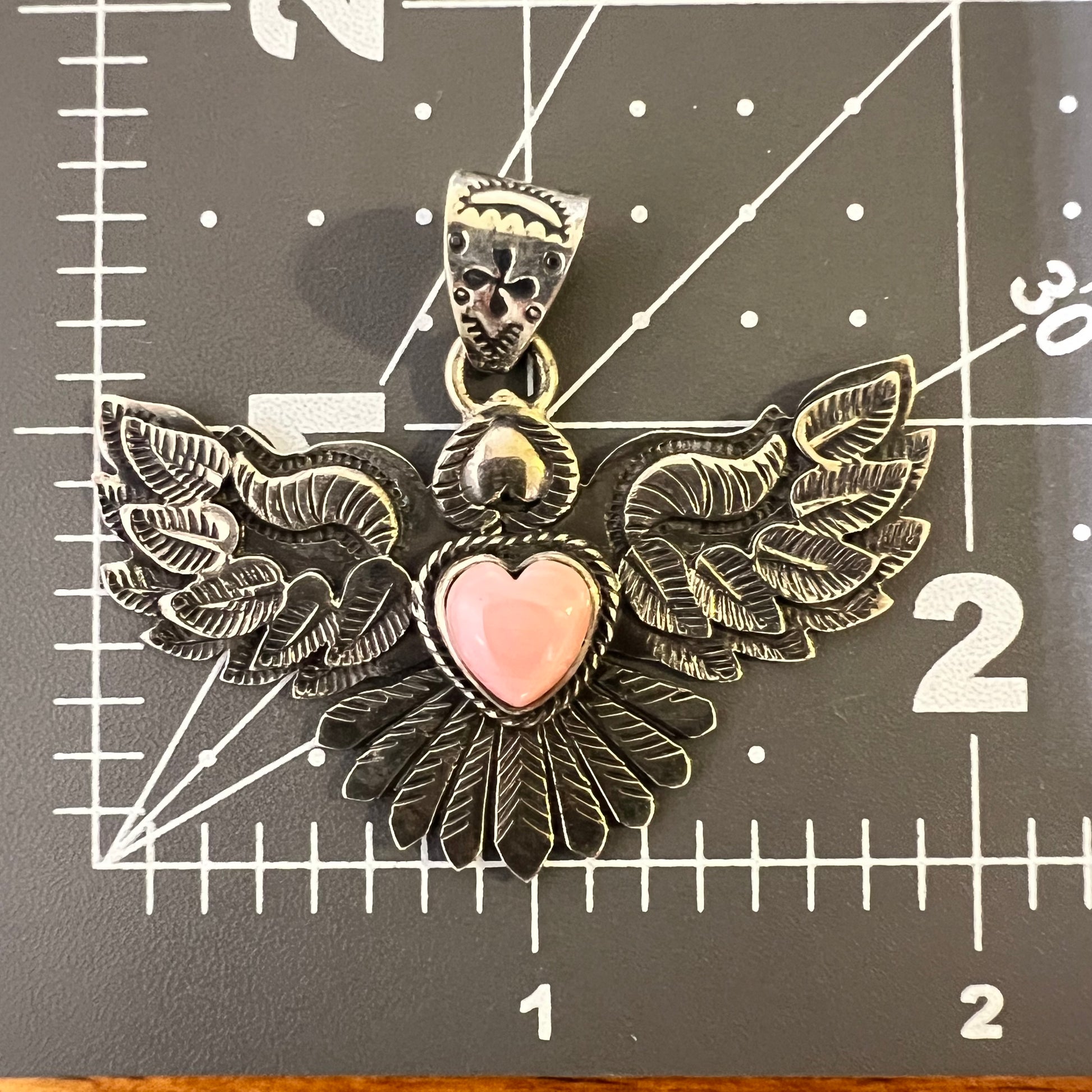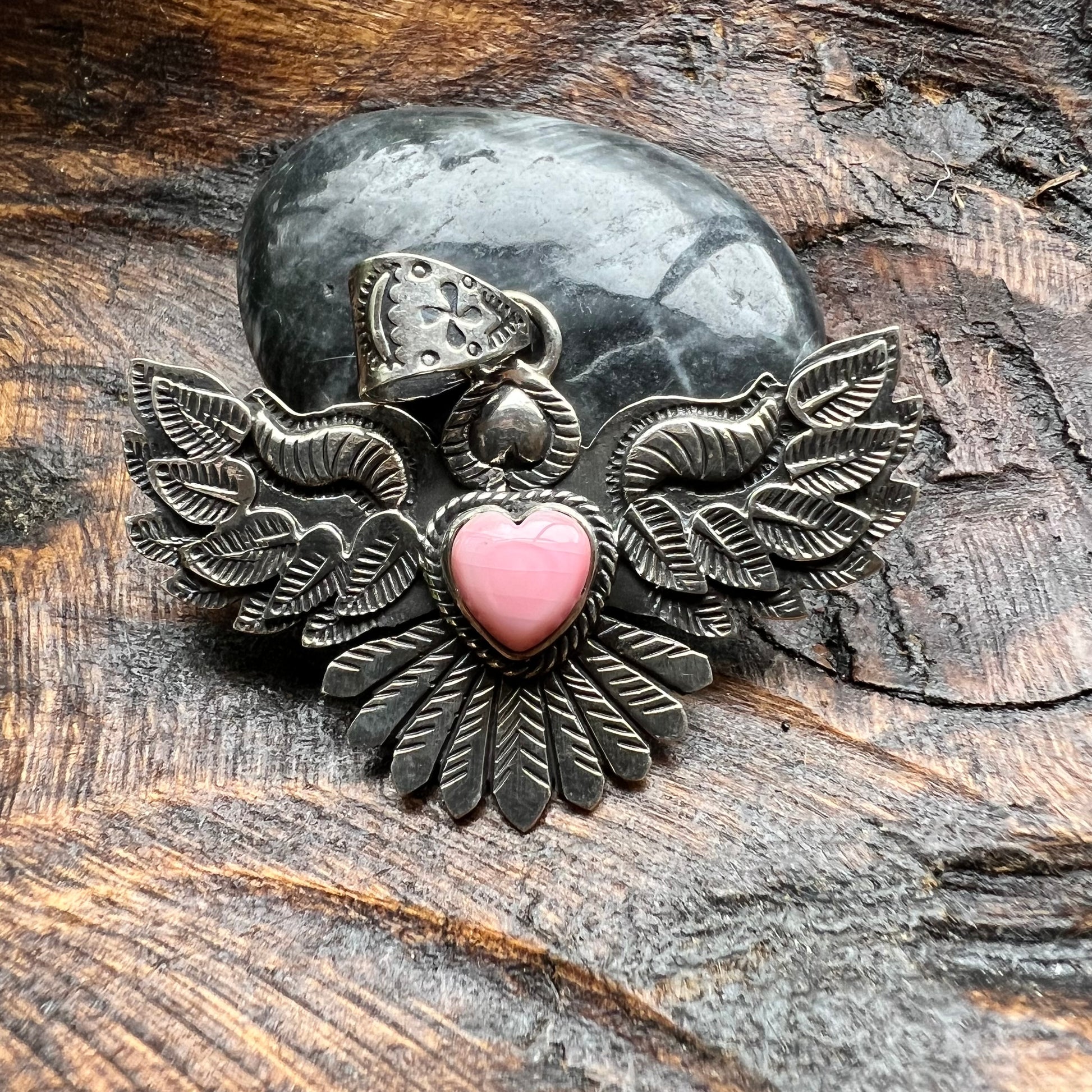 This striking eagle pendant centers around a soft pink heart-shaped Queen Conch cabochon, framed by a bold sterling silver eagle design rich with symbolism and detail. Layered feathers, hand-tooled textures, and sculptural depth give this piece a powerful presence while still feeling balanced and wearable.
